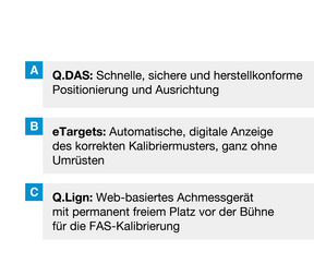 Sicherheitsrelevante FAS-Applikationen erfordern meistens eine Neukalibrierung nach vorhergehender Verstellung des Fahrwerks. Die Kombination mit dem Achsmessgerät ermöglicht die FAS-Kalibrierung in einem System, ohne das Fahrzeug erneut zu bewegen oder die Radstellung zu verändern. Da immer mehr Fahrzeuge mit Hinterradlenkung oder Dynamiklenkung ausgestattet sind, entscheidet die Lenkradposition über die Qualität der Kalibrierung. Um sicherzustellen, dass sich das Fahrzeug zum Zeitpunkt der Kalibrierung auch in Geradeausfahrt befindet, führt kein Weg an der Kombination aus Q.DAS und Q.Lign vorbei.